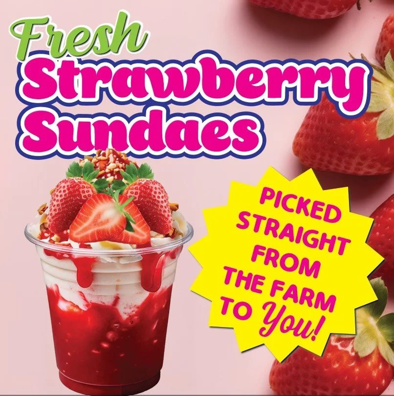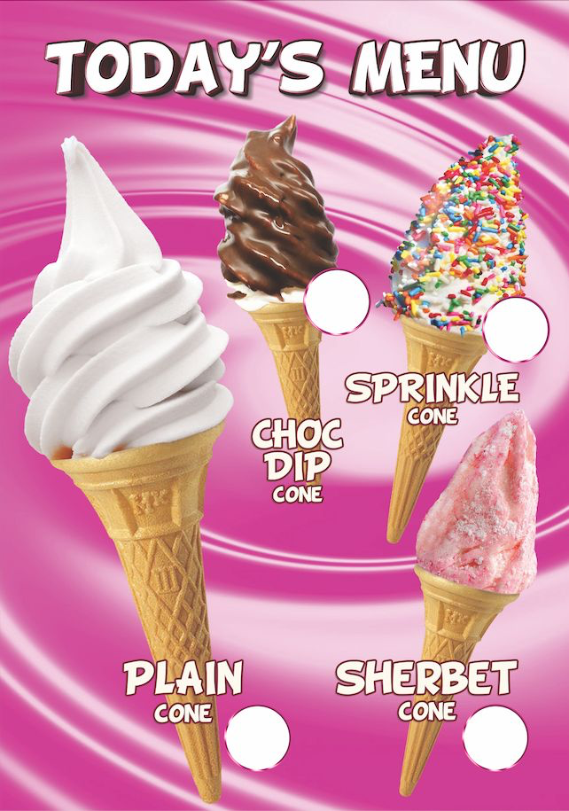 As well as all the different choices from plain to choc top, to a flake cone to sprinkles and sherbets there’s lots of choices. If cones are not for you, we have a range of Sundaes and flavours.